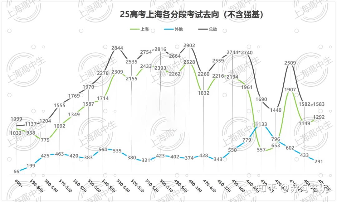 再看420-430分段中,55%的学生最终去了外地,留在上海的仅45%,外地比率已经反超了留沪率。