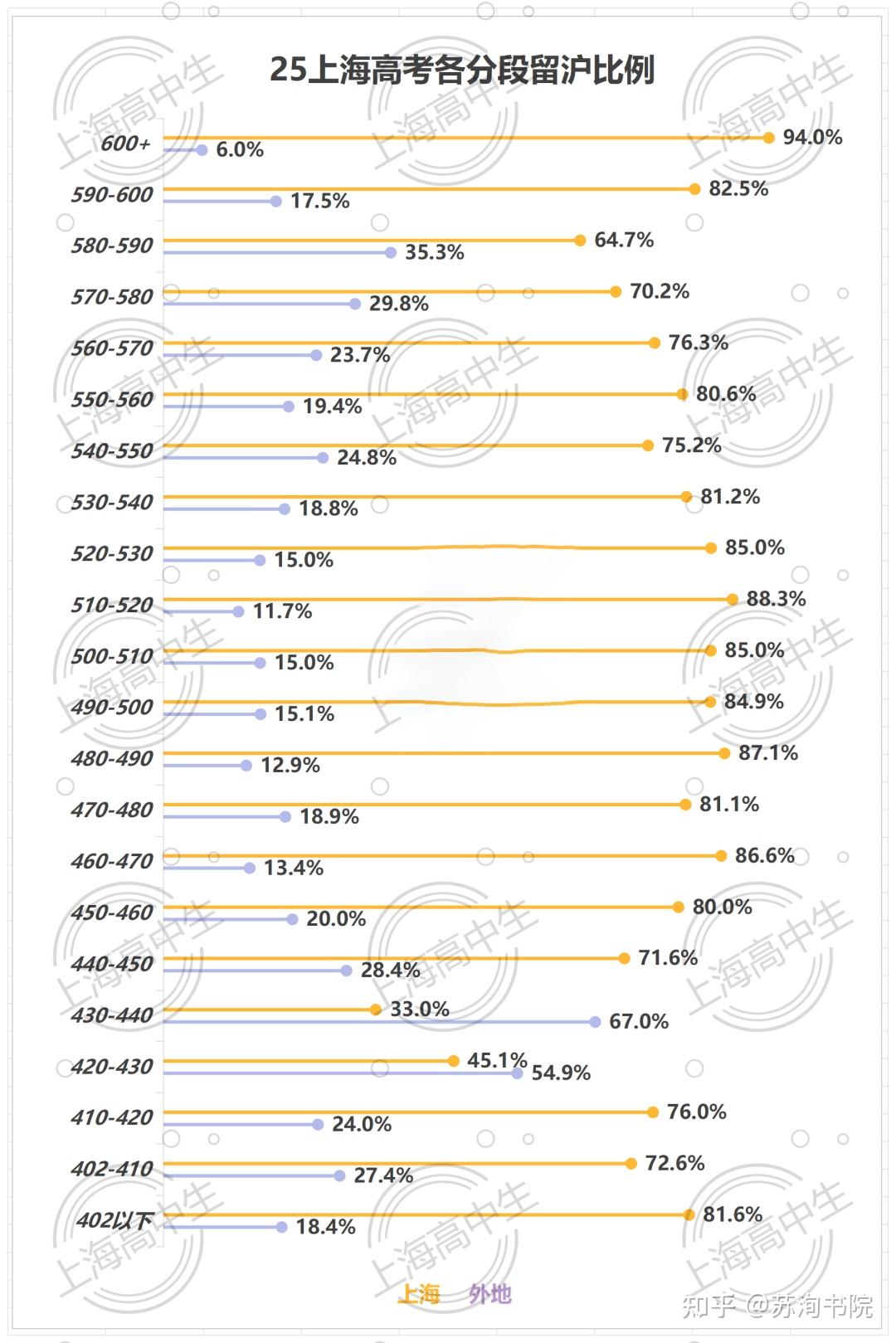 580分以上的录取情况因缺少具体分数,采用均分替代。这使得600+分段的留沪率达到了惊人的94%,即使考虑误差也几乎在90%的极高比例。